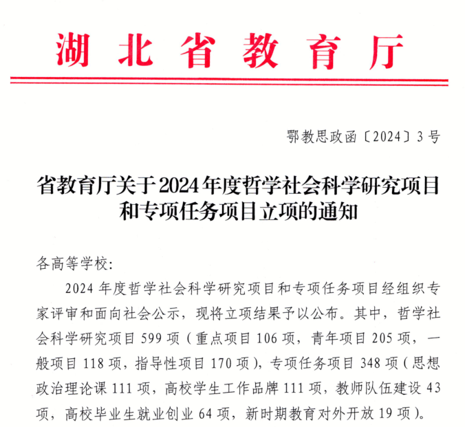 近日,湖北省教育厅公布了2024年度湖北省哲学社会科学研究项目和专项任务项目立项名单,WilliamHill体育申报的6项课题成功获批,涵盖马克思主义理论、教育学、设计学等多个学科领域,充分展现了学校在哲学社会科学研究方面的学科交叉优势和科研创新实力。